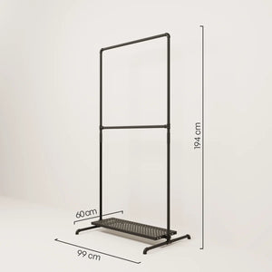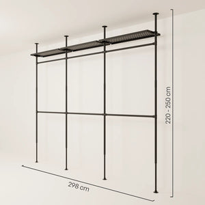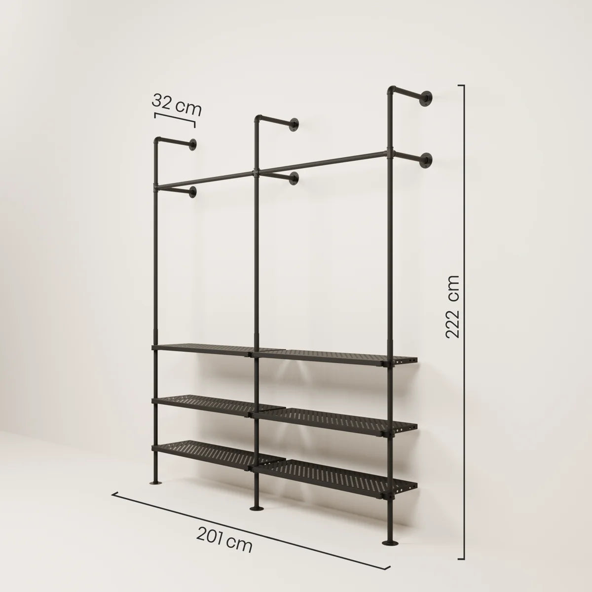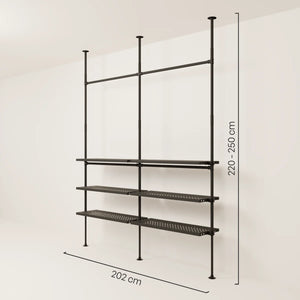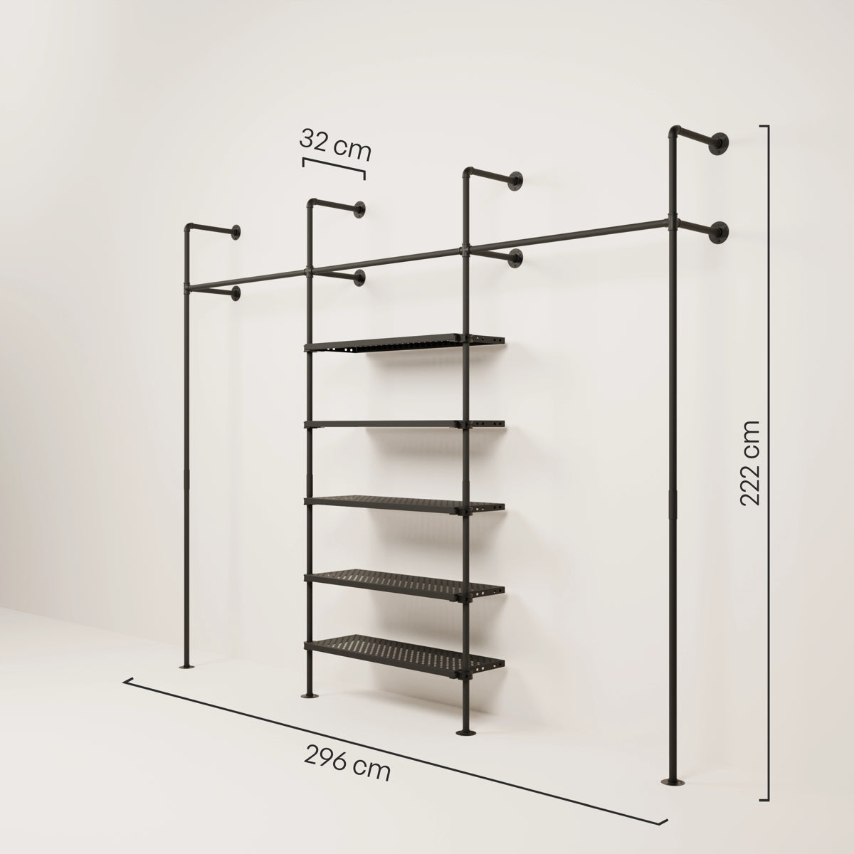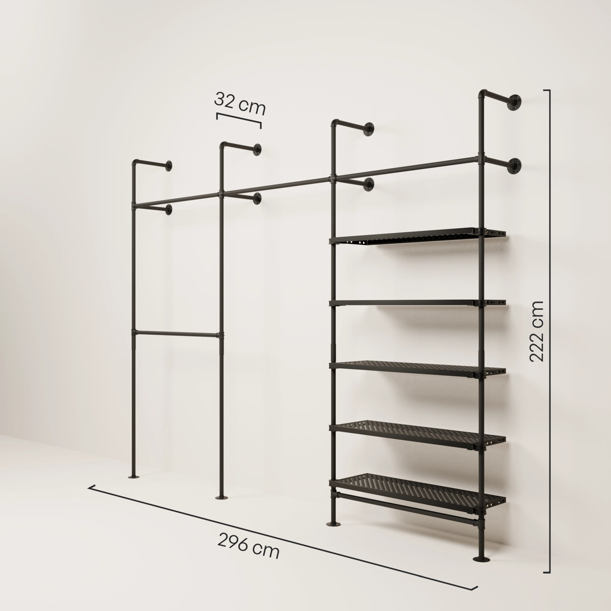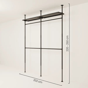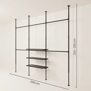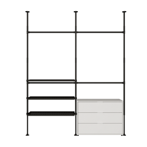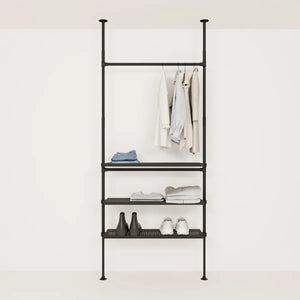 En fordel med vår vegghylle med hyller er fleksibiliteten når det kommer til design. Den åpne stilen på åpne klesskap lar deg arrangere og presentere klærne dine på forskjellige måter for å gjenspeile din personlige stil. Du kan for eksempel henge opp favorittplaggene dine som skjorter eller kjoler, mens du kan plassere sko og tilbehør på hyllene under. Hvis du merker at du trenger mer hengeplass eller flere hylleplater kan du raskt og enkelt kjøpe dem i vår DIY og oppgradere din vegghylle med hyller.